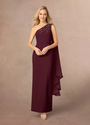Glamorous Cabernet One Shoulder Crepe Mother of the Bride Dress with One - Shoulder Crystal Embellished Strap Draped Chiffon Overlay and Slim Maxi Silhouette