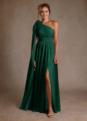 Glamorous Emerald A-Line One-Shoulder Cape-Sleeve Floral-Embellished Side Zip High-Slit Floor-Length Mother of the Bride Dress
