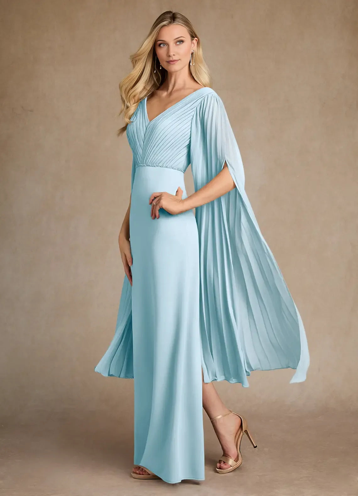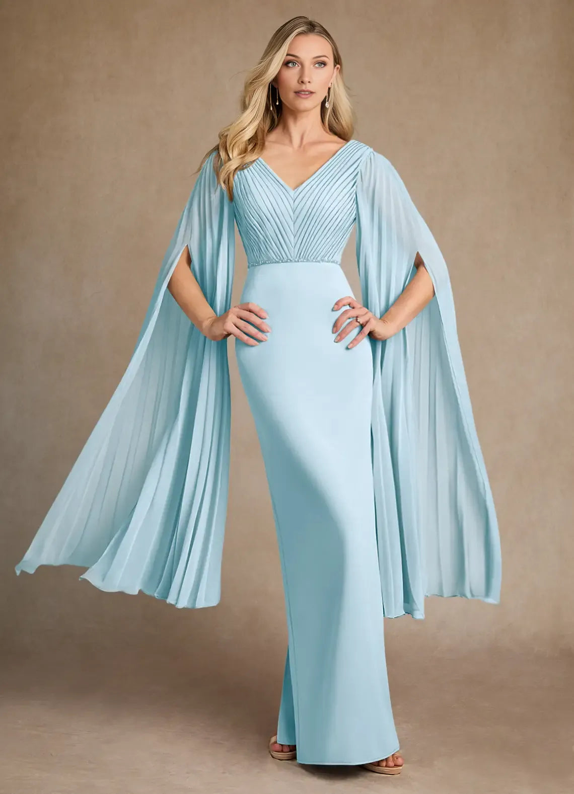 Glamorous Sky Blue Pleated Crepe Mother of the Bride Dress with Plunging V - Neck Pleated Bodice Draped Chiffon Cape Sleeves