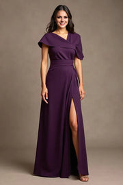 Grape Satin Asymmetrical Neck Long Mother of the Bride Dress with Slit - US 2 / UK 8 / EU 32