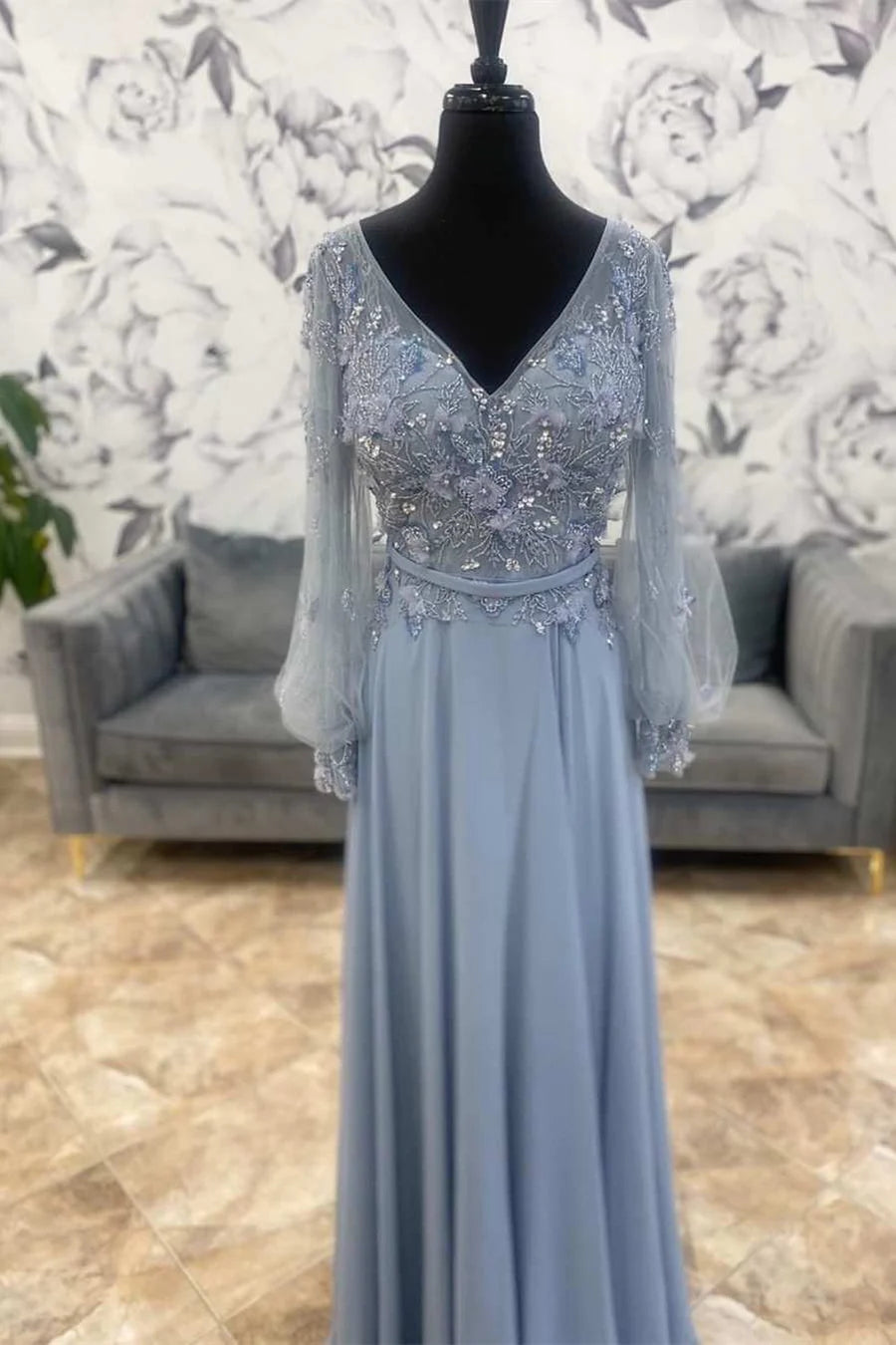 Grey Blue V-Neck Long Sleeve Beaded Mother of the Bride Dress