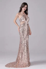 Halter Sleeveless Backless Sequined Floor Length mother's dress