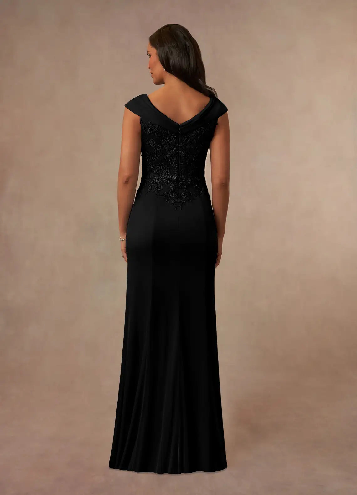 is an elegant choice to wear to your special occasion. Cut from crepe, this dress features a V-neckline and hand sewn lace applique along the waistline. The beautiful mermaid skirt will hug your curves and has a pleated cascading skirt detail for added flare.