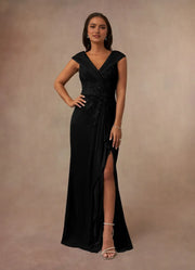 Luxury Black A-Line Lace Mother of the Bride Dresses Exquisite Surplice V - Neck Hand - Embroidered Lace Bodice Artfully Draped Ruffles High Slit Elegance Hot Sale