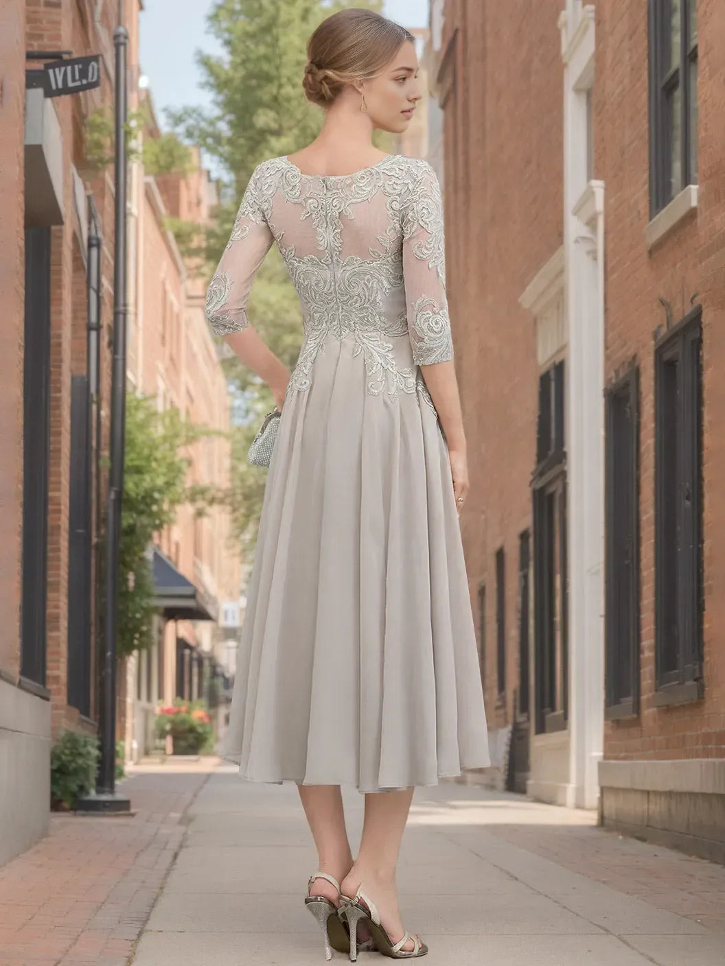 Scoop Neck Half Sleeves Tea-Length Mother of the Bride Dresses with Appliques Lace - As Pic / US 2 / UK 8 / EU 32