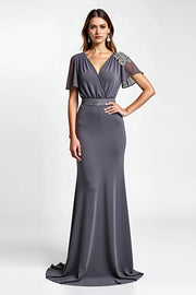 Steel Grey Sheath Beaded Long Mother of the Bride Dress with Short Sleeves - US 2 / UK 8 / EU 32