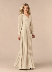 Unique Champagne A-Line Pleated long sleeve Chiffon Mother of the Bride Dresses Sophisticated Plunging V - Neck Pleated Silhouette Sheer - US 2 / UK 8 / EU 32