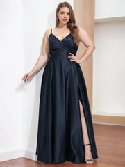 Elegant Navy Blue A-Line V-Neck Spaghetti Straps Lace-Up-Back Satin Slit Floor-Length Plus Size prom Dresses with Split Side