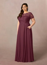 Romantic A-Line Boat Neck Short Sleeve Lace Applique Sequins Back Zip Chiffon Floor-Length Plus-Size Prom Dresses - US 2 / UK 8 / EU 32