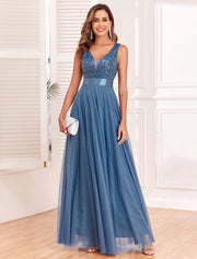 A-Line Evening Gown Elegant Dress Evening Party Prom Floor Length Sleeveless V Neck Belt  Sash Tulle V Back with Glitter Embroidery - Sky Blue / US 2 / UK 8 / EU 32