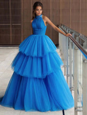A-Line Prom Tiered Dresses Party Dress Evening Party Cocktail Party Floor Length Sleeveless Halter Neck Polyester with Pleats Beading - US 2 / UK 8 / EU 32