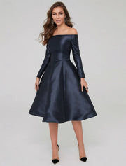 A-Line Special Occasion Dresses Elegant Dress Wedding Guest Cocktail Party Knee Length Long Sleeve Off Shoulder Satin with Pleats Derby Dresses - US 2 / UK 8 / EU 32