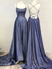 Beautiful Spaghetti Straps Backless Long Blue Party Formal Dresses