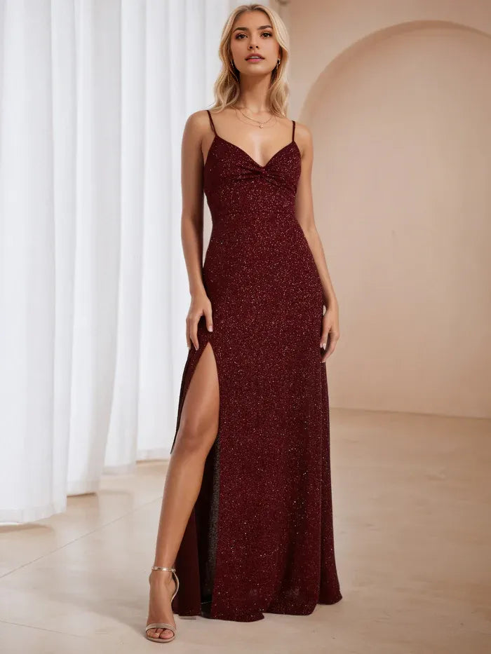 Glitter Burgundy Spaghetti Straps Formal Dresses with Split