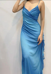 Gradient Blue Glitter Chiffon Party Dress Spaghetti Straps Ruffles Long Prom Dresses
