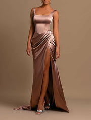 Mermaid Evening Gown High Split Dress Wedding Guest Cocktail Party Floor Length Sleeveless Scoop Neck Bridesmaid Dress Satin with Ruched Masquerade Dress - Dusty Rose