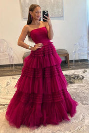 Fashionable and elegant A-line strapless long slit chiffon multi-layer dance party dress - Fuchsia / US 2 / UK 8 / EU 32