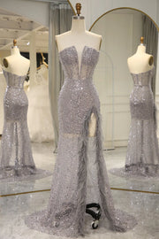 Grey long slit strapless feather mermaid party dress