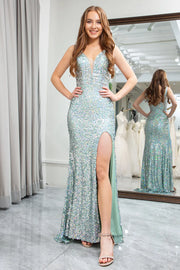 Light green sequined mermaid V-neck long slit ball party dress - US 2 / UK 8 / EU 32