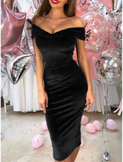 Women's Black Dress Midi Dress Ruched Sexy Casual Off Shoulder Short Sleeve Black Wine Blue Color - Black / US 2 / UK 8 / EU 32