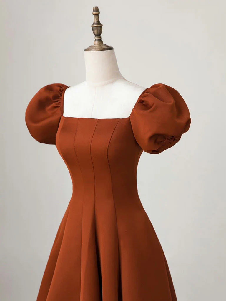 A-Line Puff Sleeves Satin Long Prom Dress Long Evening Dresses