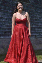 A-Line Spaghetti Straps Glitter Sleeveless Long Prom Dress with Slit - Red / US 2 / UK 8 / EU 32