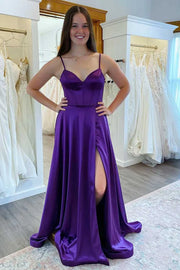 A-Line Spaghetti Straps V-Neck Sleeveless Pleated Long Prom Dress with Slit