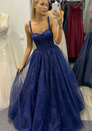 A-line Sweetheart Spaghetti Straps Long/Floor-Length Tulle Glitter Prom Dress