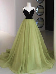 A-Line V Neck Green Tulle Long Prom Dress Green Formal Dress