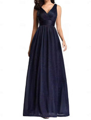 A-Line Wedding Guest Dresses Party Dress Evening Party Prom Floor Length Sleeveless V Neck Cotton Backless with Glitter Ruched - US 2 / UK 8 / EU 32