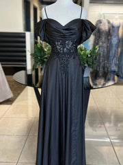 Black Satin Off Shoulder Long Party Dress Black Satin with Lace Prom Dress - US 2 / UK 8 / EU 32
