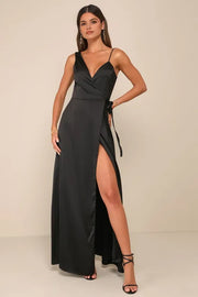Black Satin Prom Dress featuring Asymmetric Spaghetti Strap Plunging V - Neck Wrap Around Bodice with Tie and High Side Slit