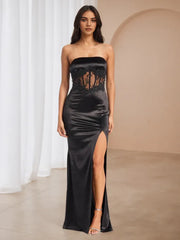 Black Strapless Velvet Prom Dress Lace - Inset Corset Side Slit for Alluring - US 2 / UK 8 / EU 32