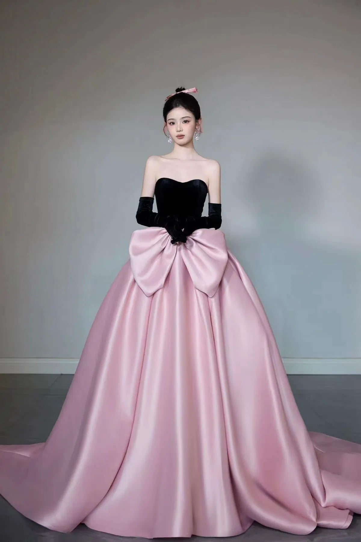 Black Velvet and Pink Satin Long Prom Dress Beautiful A-Line Strapless Party Dress - US 2 / UK 8 / EU 32