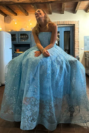 Blue A-Line Strapless Lace Appliques Sleeveless Long Prom Dress