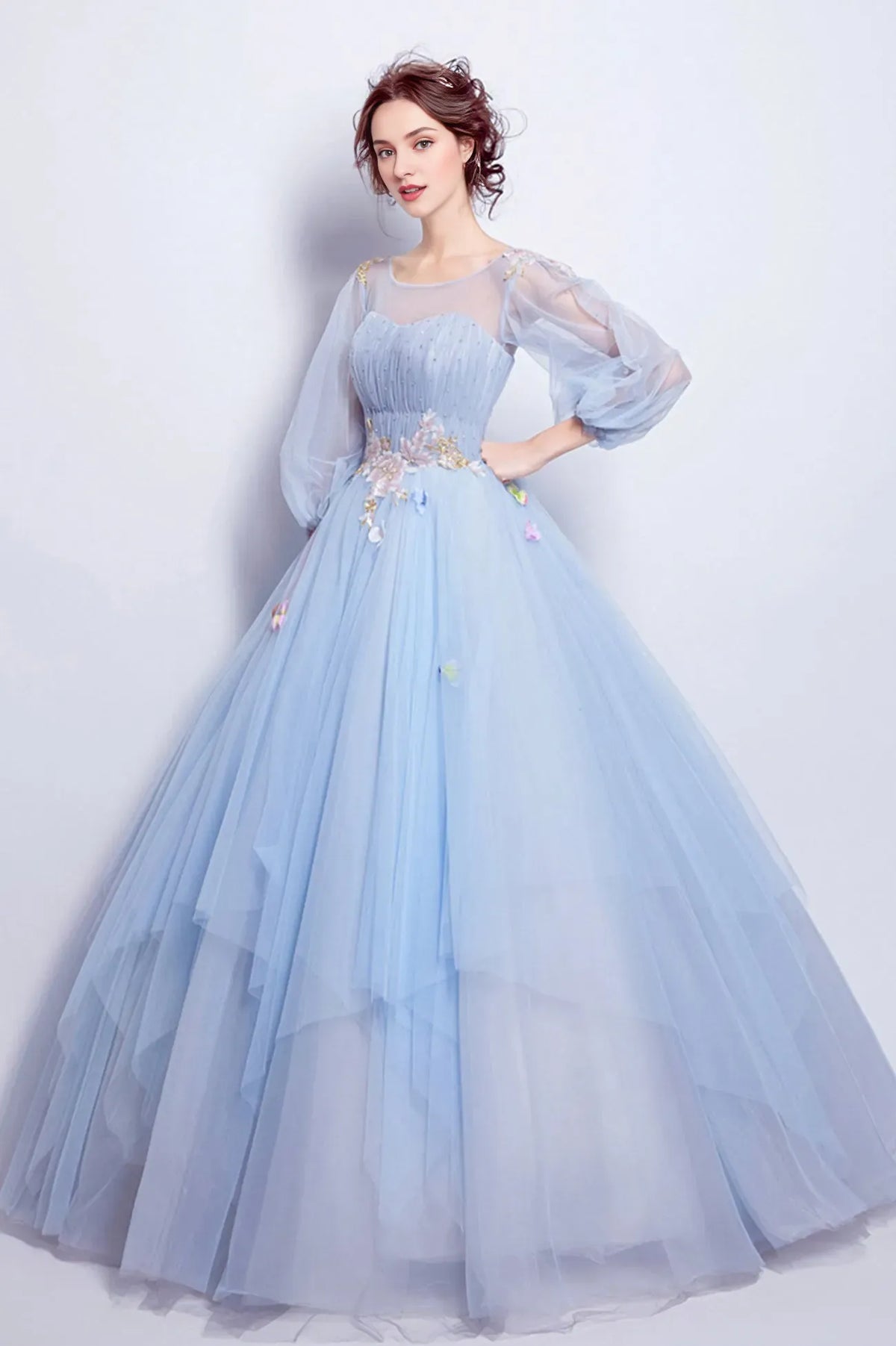 Blue Tulle Long A-Line Prom Dress Long Sleeve Lace Formal Gown