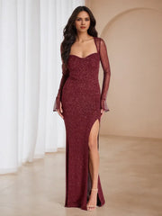 Burgundy Glitter Prom Dress Sheer Mesh Sleeves Sweetheart Neckline Side Slit for a Stunning Gala Appearance - US 2 / UK 8 / EU 32