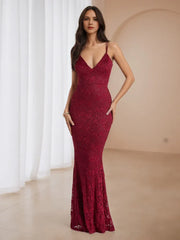 Burgundy Lace Mermaid Prom Dress Deep V - Neck Spaghetti Straps for Timeless Gala Elegance - US 2 / UK 8 / EU 32
