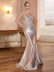 Champagne Sparkly Trumpet/Mermaid Spaghetti Straps Lace Sequins Long Prom Dress