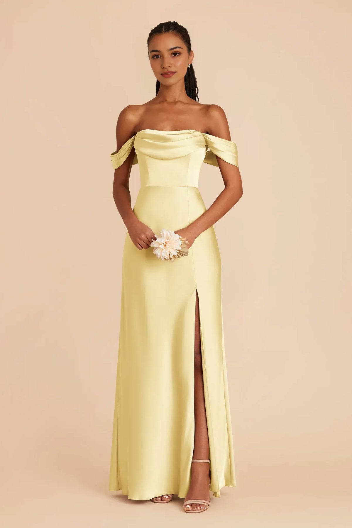 Champagne Yellow Off Shoulder Satin Evening Dress | Formal Ball Gala Gown with Slit - US 2 / UK 8 / EU 32
