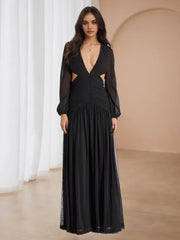 Chic Black Prom Dresses Plunge Neckline Sheer Sleeves Side Cutouts for Elegant Galas - US 2 / UK 8 / EU 32