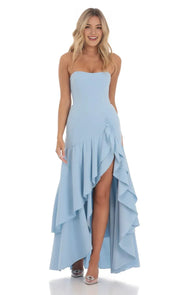 This light blue prom dress is crafted from luxurious satin, offering a smooth and glossy finish. It features ruffled shoulder straps that add a touch of feminine charm, paired with a plunging V - neckline for an alluring silhouette. The fitted bodice flows into a mermaid - style skirt, hugging the curves gracefully. Perfect for proms or formal events, it combines elegance and romance to make you stand out.