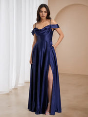 Chic Navy Satin Ball Gown Asymmetric Off Shoulder Side Slit Pockets for Glamorous Proms - US 2 / UK 8 / EU 32