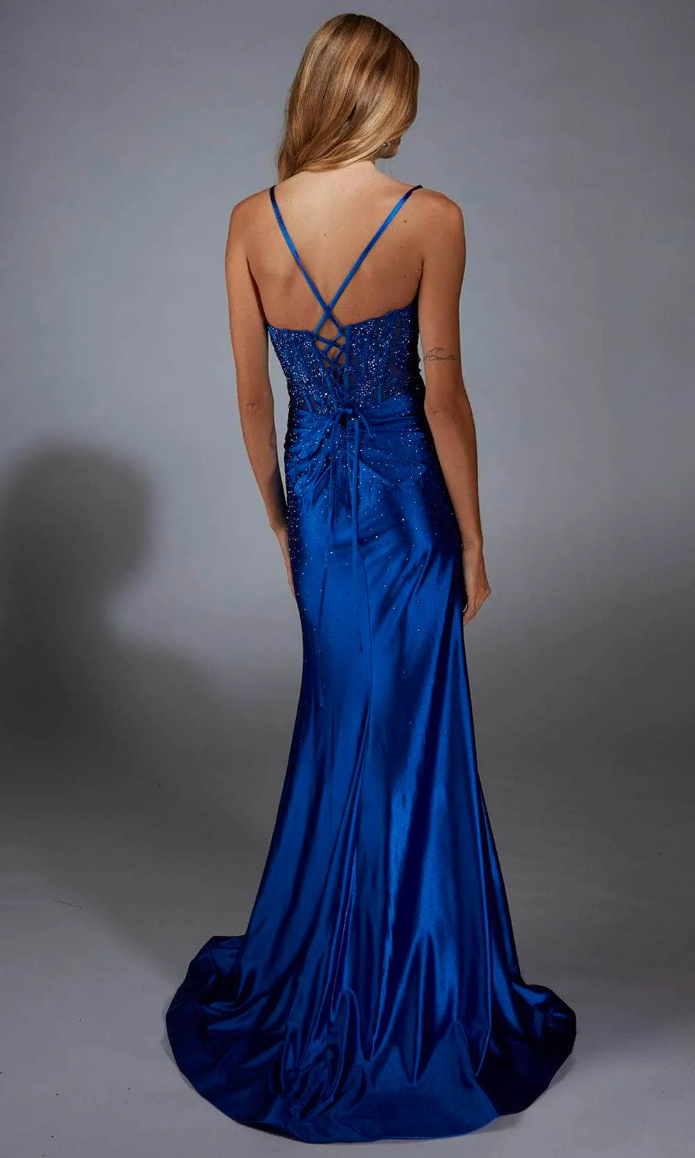 Opt for understated sophistication with this elegant sapphire blue satin prom dress. The beaded bodice adds a touch of luxury without being overly elaborate, and the subtle slit provides just the right amount of allure. The smooth satin fabric drapes elegantly, creating a streamlined silhouette that exudes grace. Perfect for minimalist galas or upscale events where simplicity is key, this dress lets you shine with refined elegance.