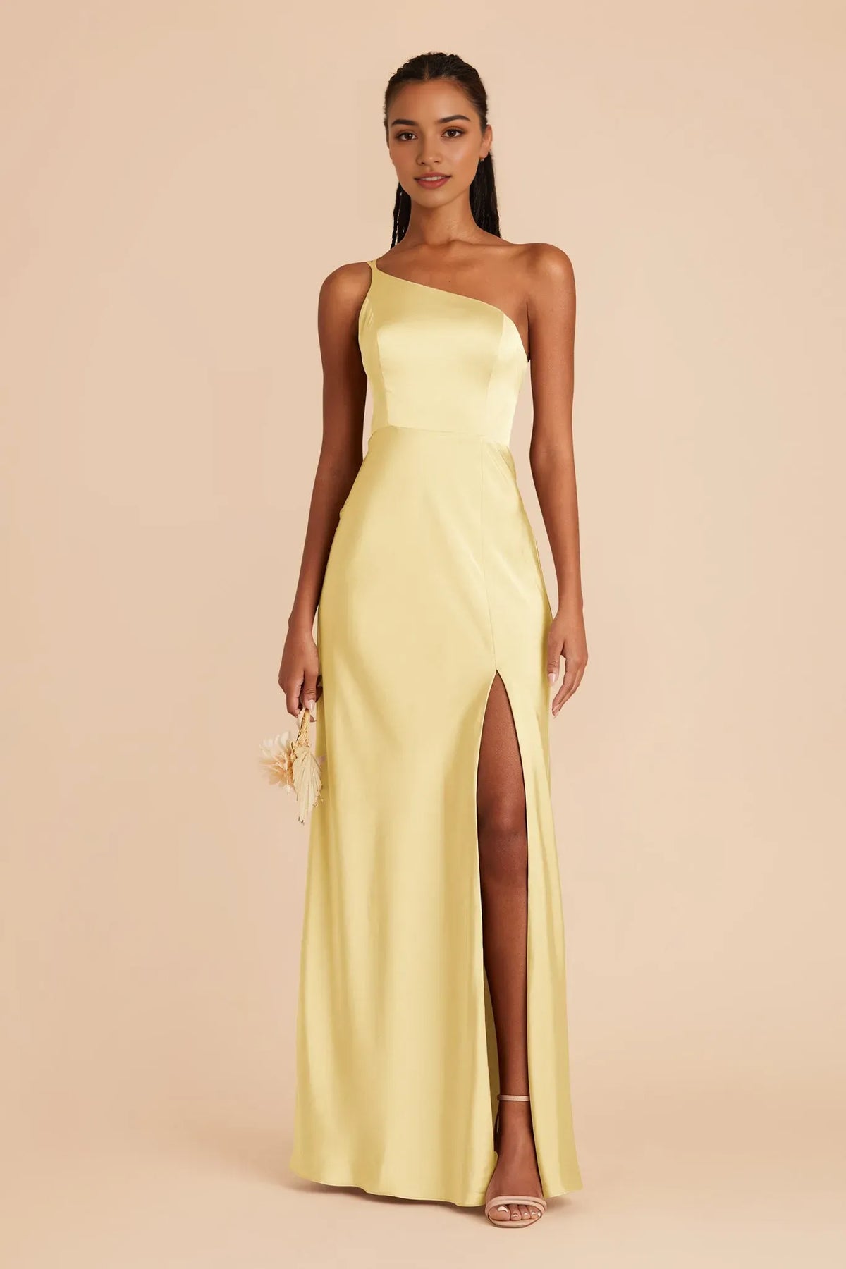 Embrace timeless grace in this yellow one - shoulder satin gown. The one - shoulder neckline flatters with understated elegance, the side slit adds gentle movement, and satin fabric exudes luxury. Ideal for proms or formal events where you want to radiate classic, sophisticated charm.