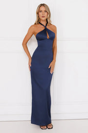 Step into classic with LuodiLan's mermaid-style prom dress. It features a halter neck (with twist detail), a keyhole cutout front, a square open back, a sleek fitted silhouette, a high-slit hem, and luxurious navy blue satin fabric. The gown exudes timeless sophistication and allure, making it perfect for evening events, formal galas, and special occasions.