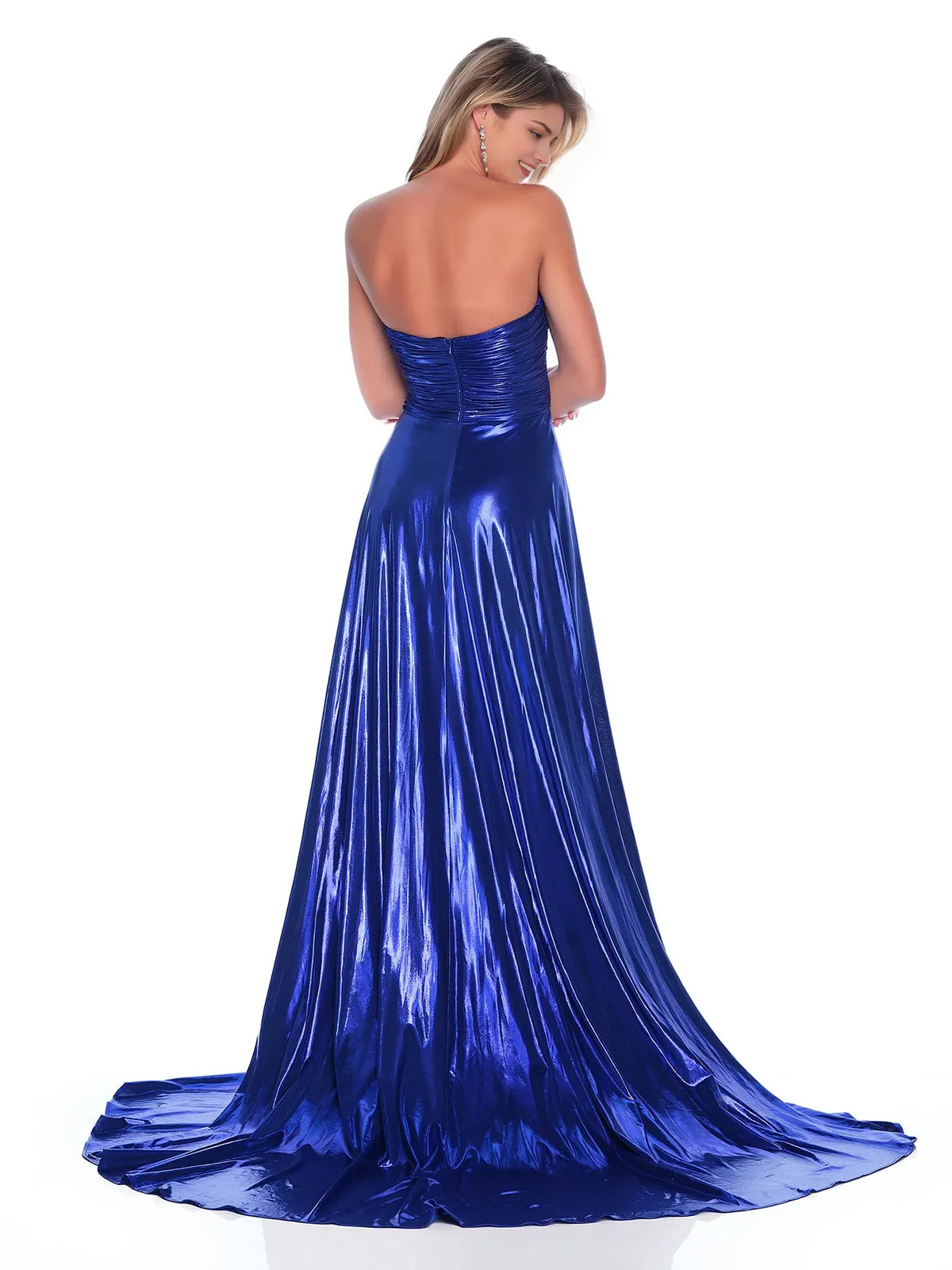 Classic Royal Blue A-Line Sweetheart-Neck Strapless Back Zip Floor-Length Ruched Metallic Satin Prom Dresses with High Slit