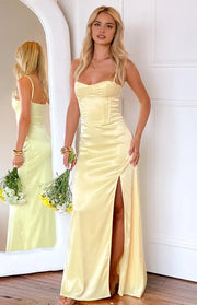Classic Yellow Satin Prom Dress Spaghetti Straps Corset Inspired Bodice Side Slit Silhouette for Timeless Elegance - US 2 / UK 8 / EU 32