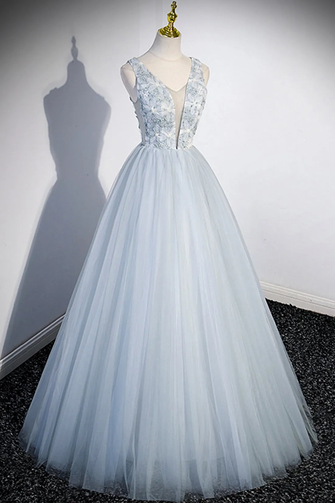 Cute V-Neck Tulle Long Prom Dress Gray Evening Dress Party Dress