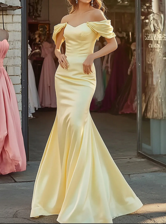 Daffodil Satin Mermaid Long Off the Shoulder Prom Dress